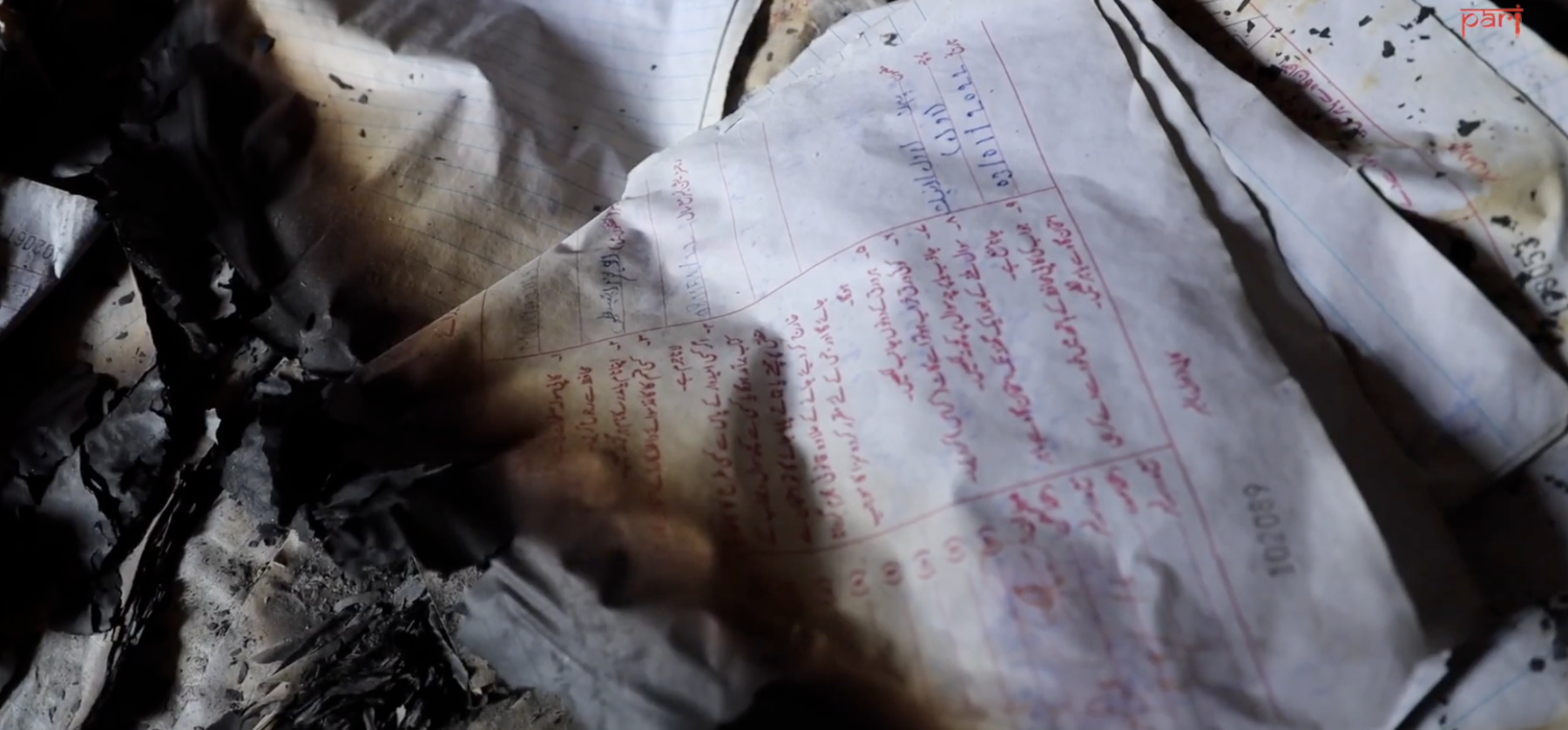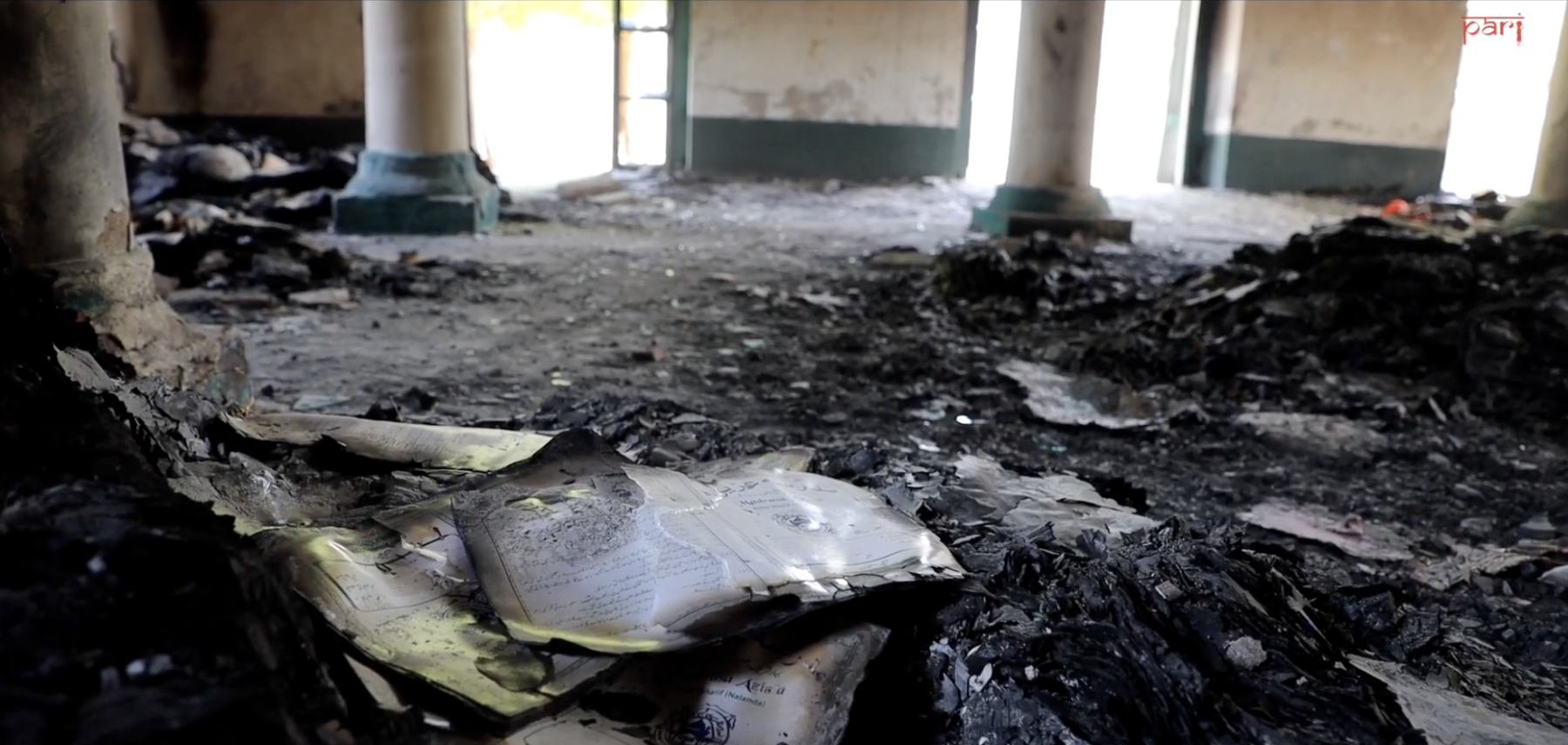 On the participatory nature of independent reporting, Katyayini noted that while navigating the conversations and editing video footage, the reporter’s voice is made visible, but “everything else belongs to the people.” For instance, the first half of the film stitches together the mobile phone footage recorded by the principal, teachers and students of their school and library before its burning. Student-made posters cover the walls, alongside well-stocked shelves, as students make presentations and sing during assembly. The film later reveals the charred remains of these same spaces, now filled instead with half-burnt pages and puppies asleep in the ashes for warmth. For Katyayini, these moments in the film do more than set the scene—they make stories more palpable for a media audience that has turned numb. She shares,