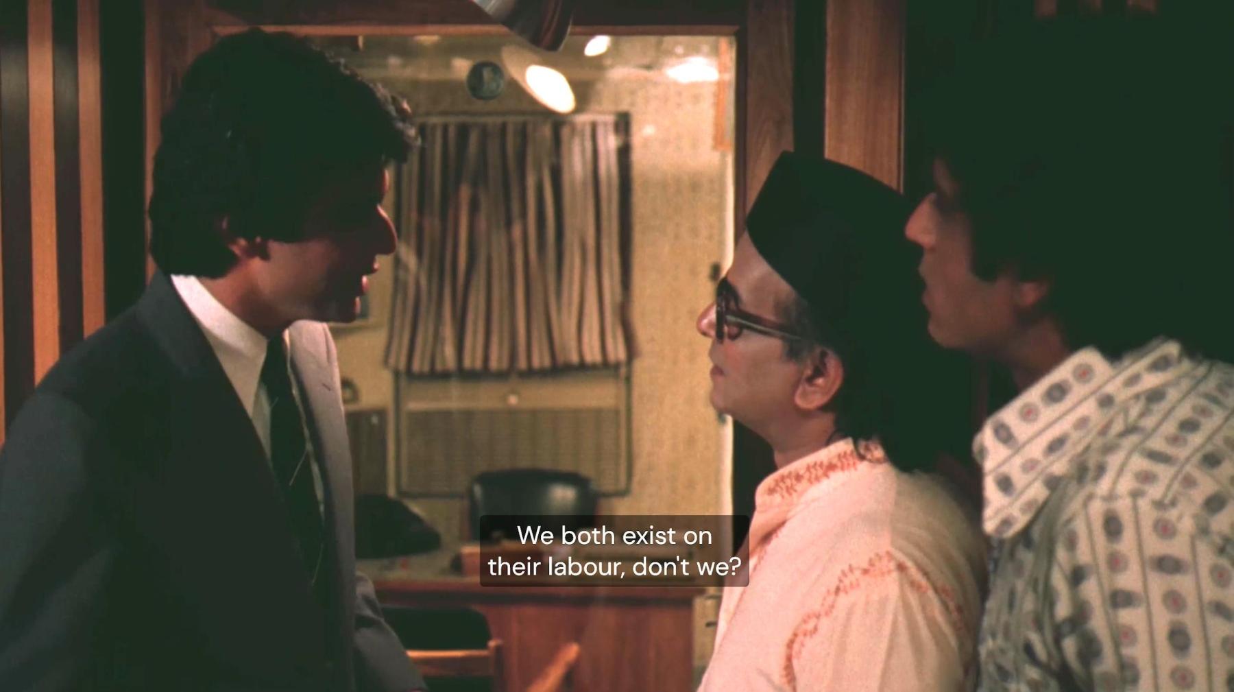 We begin our journey, not in Bombay but in an unnamed village, and we hear, not an urban soundscape but a riff that seems to echo the notes and rhythms of workers’ folk songs. Shots of the village and its inhabitants at daybreak lead to a montage of weavers in the village handcrafting an intricate carpet. Aesthetically, the sequence seems incongruous with the rest of the film. As soon as we see the finished product, the film cuts abruptly to a storefront in Bombay where the same carpet hangs—transported, in a flash, from the environment of its creation to that of its commodification. A close-up reveals that the store accepts “Americard” as well. By situating the object, at the outset, with its creators in the location and process of its creation, Mirza urges us to see it as the artisans’ work, their labour, before anything else. This leap, also signifying Mirza’s leap from documentary cinematographer to auteur, holds up a mirror to the audience.