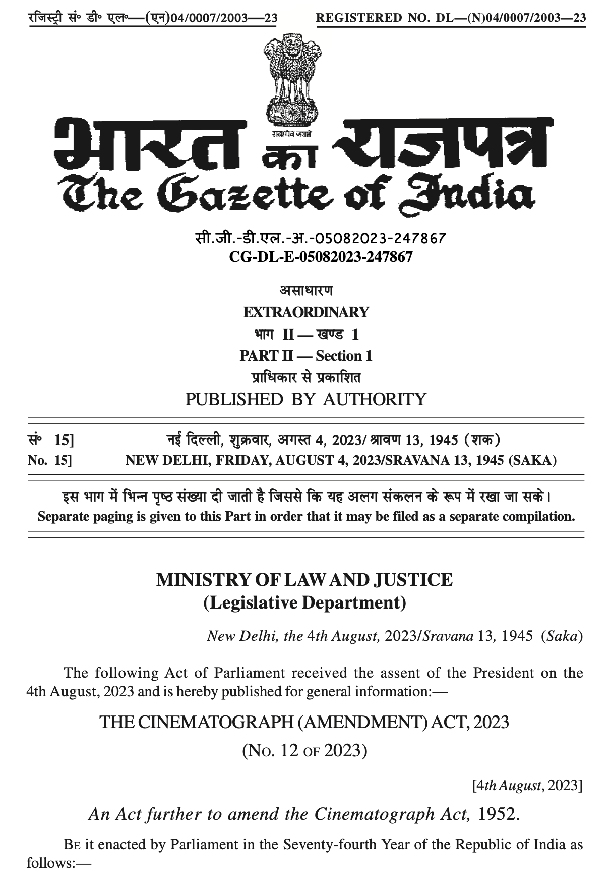 The Cinematograph (Amendment) Act, 2023, in The Gazette of India. Image Courtesy of The Gazette of India.