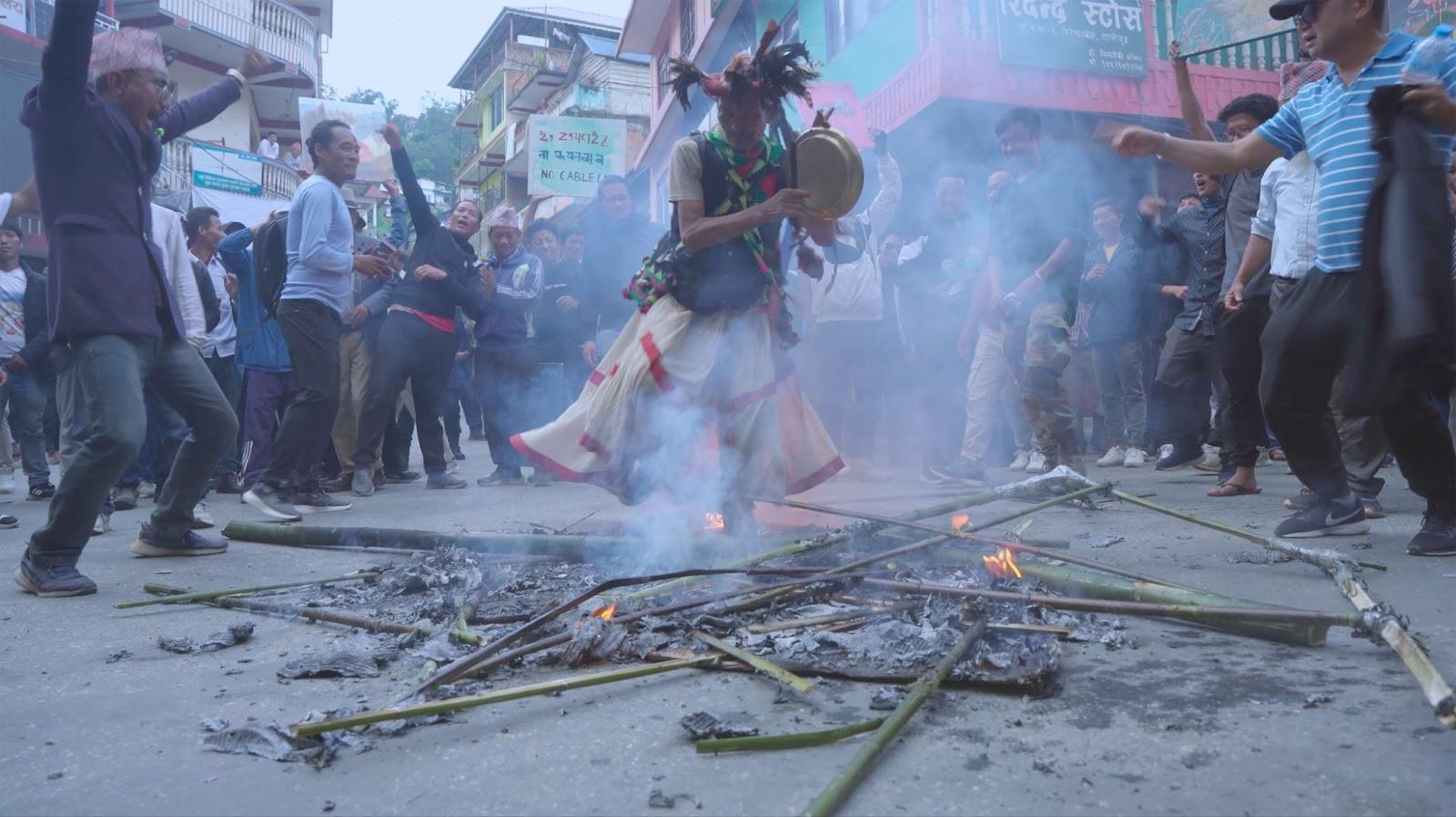 ML: The video deals with large-scale infrastructural projects that are funded by individuals with big capital or connections to the political sphere of Nepal. They are able to push through such projects despite many controversies. The work is trying to address the repercussions of the privatisation of such capitalisation of both natural and sacred landscapes. It is an example of how communities in Nepal are responding to these types of predicaments.