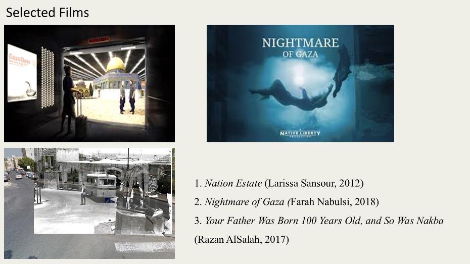 Slide from Adhila Abdul Hameed’s presentation “Fragmented Landscapes, Displaced Memories: Materiality and Aesthetics in Experimental Palestinian Short Films” focused on these three short films.