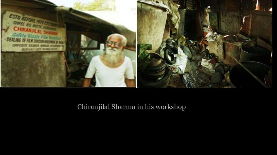 Slide from Keshavanandhan Rajaram’s presentation “Recycling and Archiving Indian Cinema: Intersections of Sustainability and Cultural Preservation” illustrating Chiranjilal and his shop.