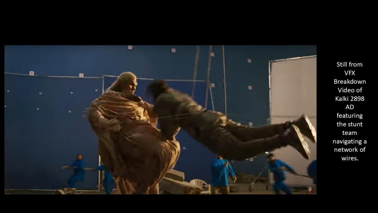 Slide from Rini Dasgupta’s presentation “The Obscure Objects of Film: The Circulation of Behind-the-Scenes Filmic Objects through VFX Breakdown Videos” capturing the stunt artist’s face which the VFX artists would later erase in the final version. (Image source: Kalki 2898 AD - VFX Breakdown by Haymaker VFX.)