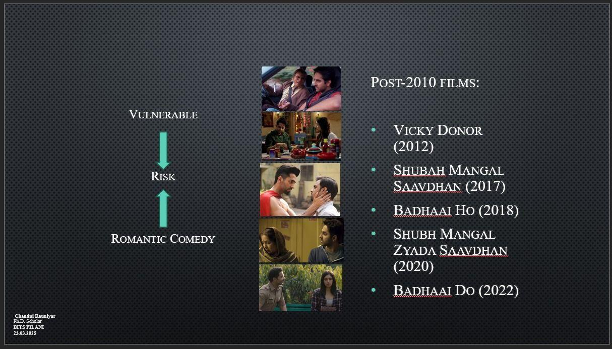 Slide from Chandni Rauniyar’s presentation “Less than a Hero, More than a Man: Gender, Genre and Affect in Popular Hindi Cinema” which focused on these five films, mostly based in small towns in North India.