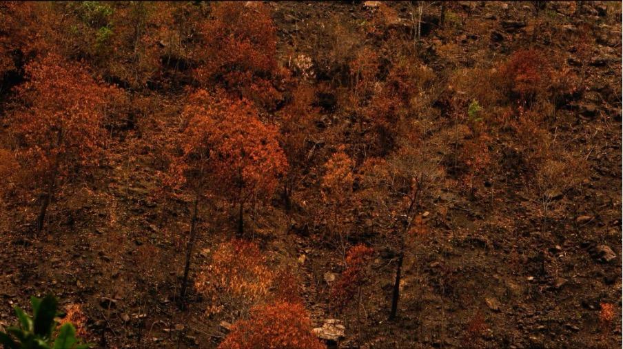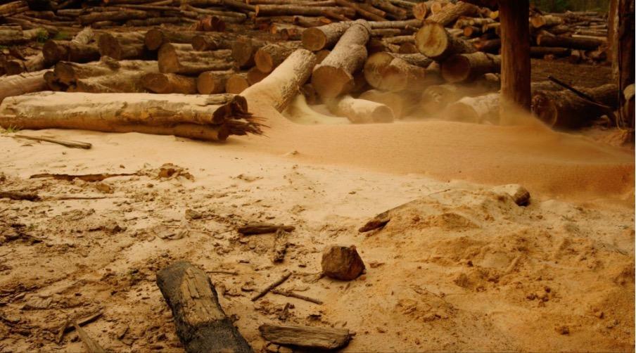 This film highlights how ancestral memories carry wrath and pain together, reflecting the emotions of the forest and the long violence of the past and its aftermath. These sacred forests, once guardians of the people, are now commodified into timber and reduced to mere profit. Stacks of cut trees are piled up, while the sawdust surrounding them depicts the man-made destruction.