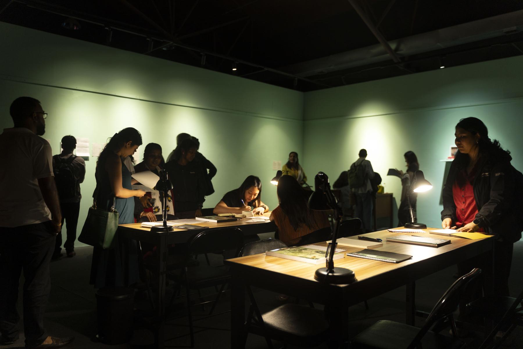 Visitors write at the desk set up for letters dedicated to their mothers.
