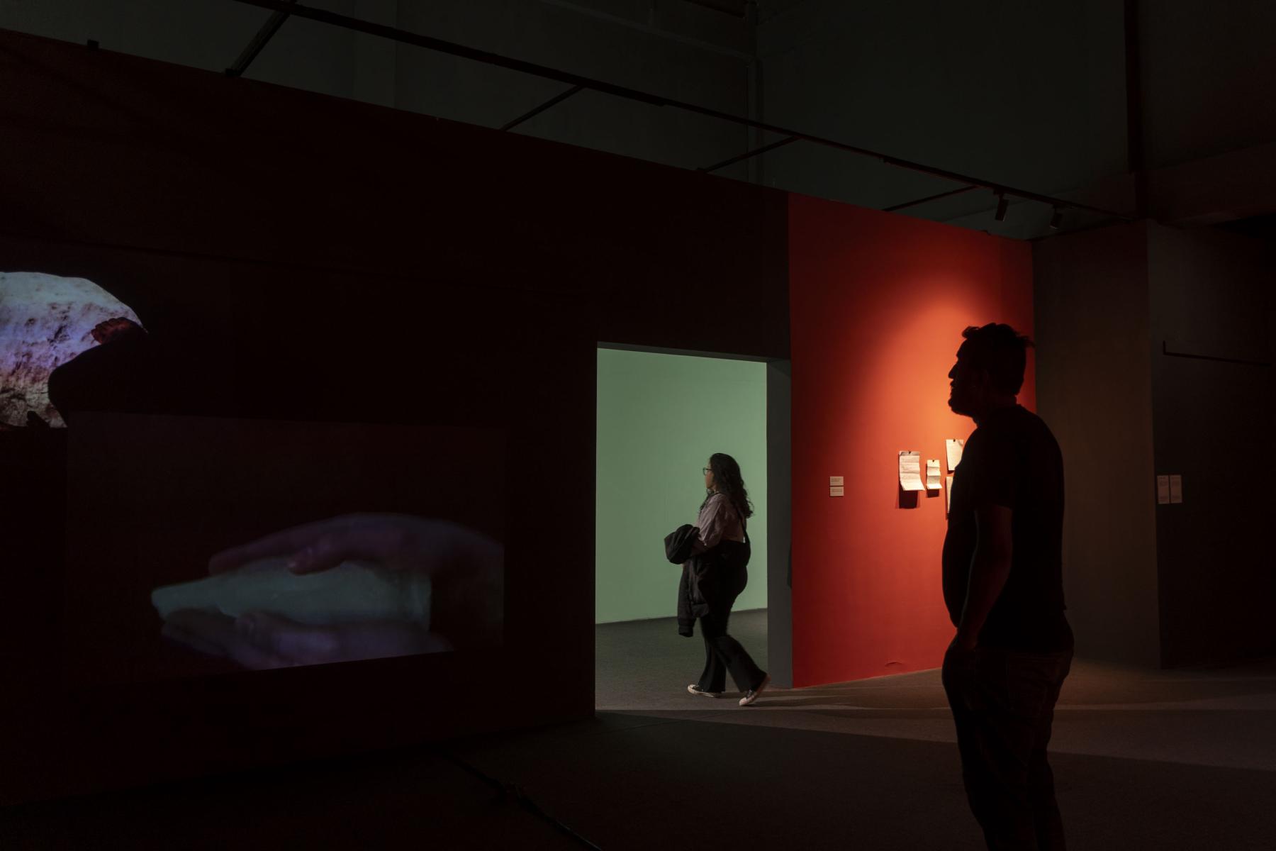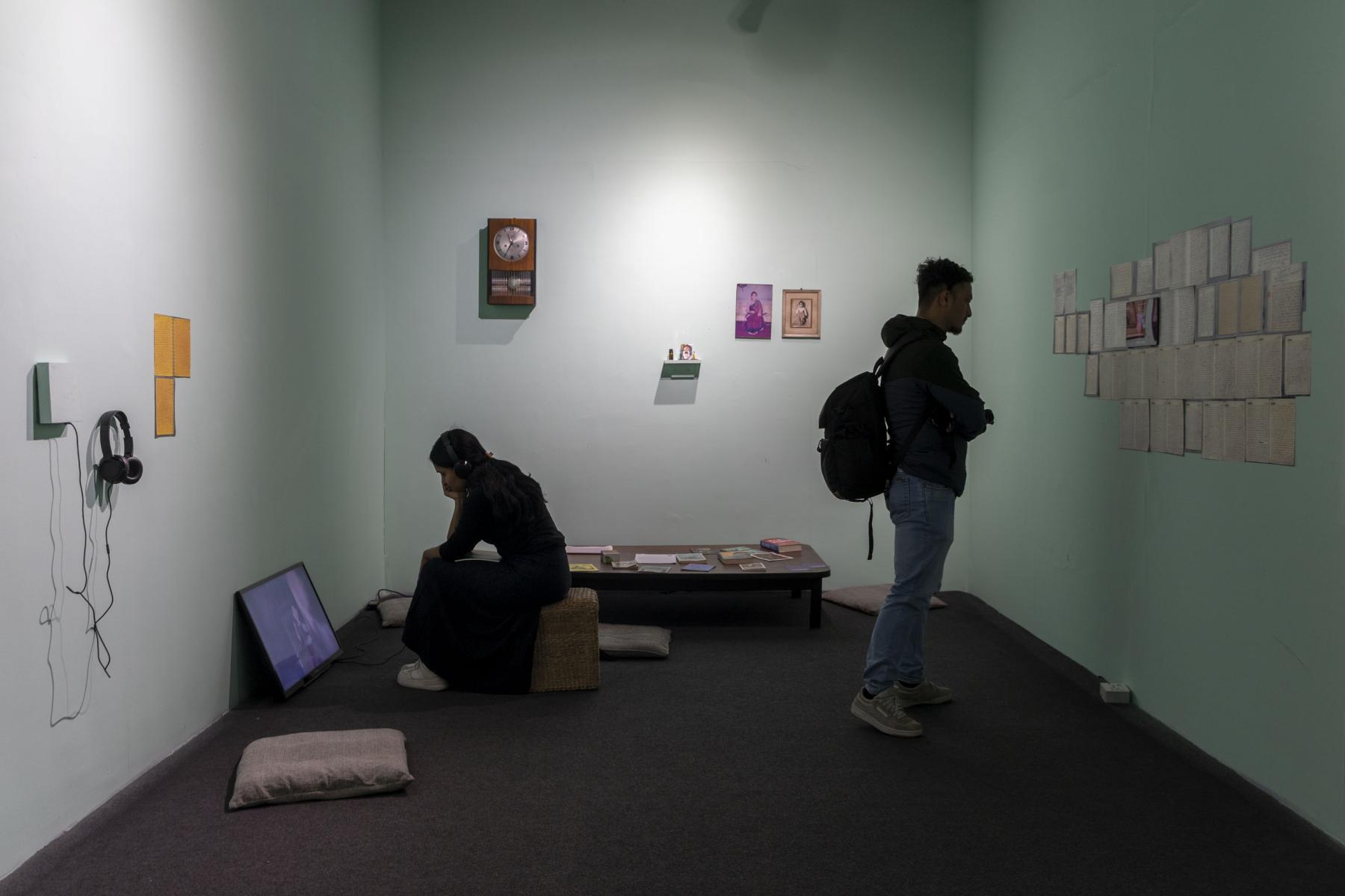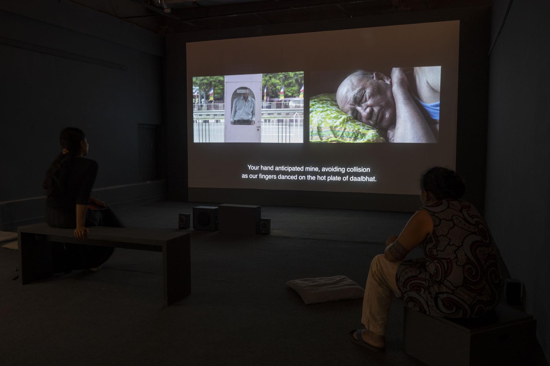 An image from the exhibition space with Shradha Devkota’s "The Urgency of Now" in the backdrop — a video installation engaging with themes of home, memory and the body as both material and site of performance.