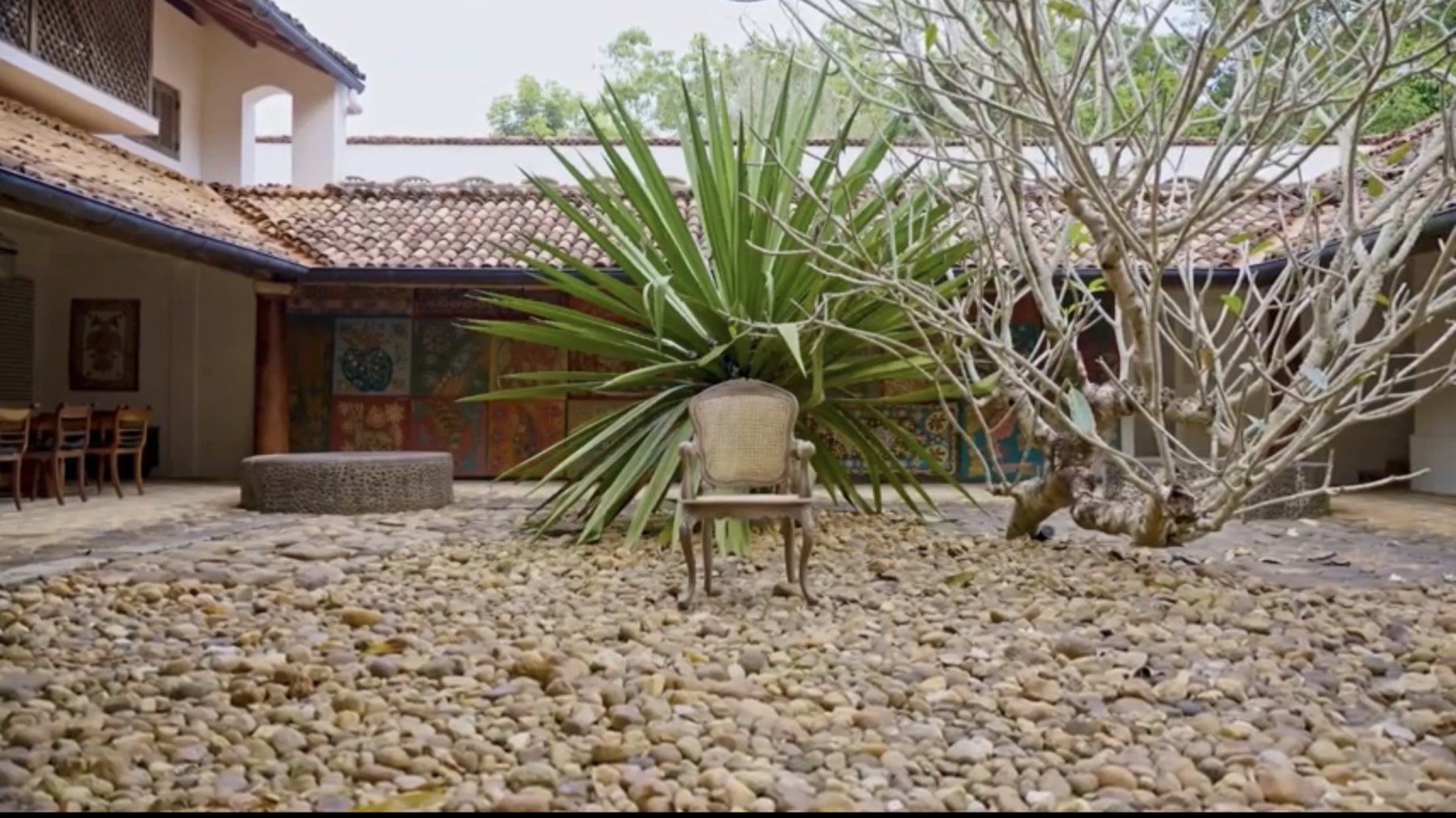 The architectural drawings coming out of Geoffrey Bawa’s office are incredible works of beauty. They painstakingly represent, with accuracy and grace, details such as leaves, pebbles or water streams. At times, they are also populated with objects of living that speak to the realities the architect imagined and, subsequently, observed in his buildings once projects were completed. Whereas the moving image could have been a tool to access these realities and their complexities, The Genius of the Place is instead punctuated by frames of Bawa-designed chairs sitting empty against the landscapes of the architect’s projects. Like the film, the frames are certainly a treat to the eyes, but Bawa’s seat on the table remains empty—filled instead by distant views of what his world, and his architecture, were about.