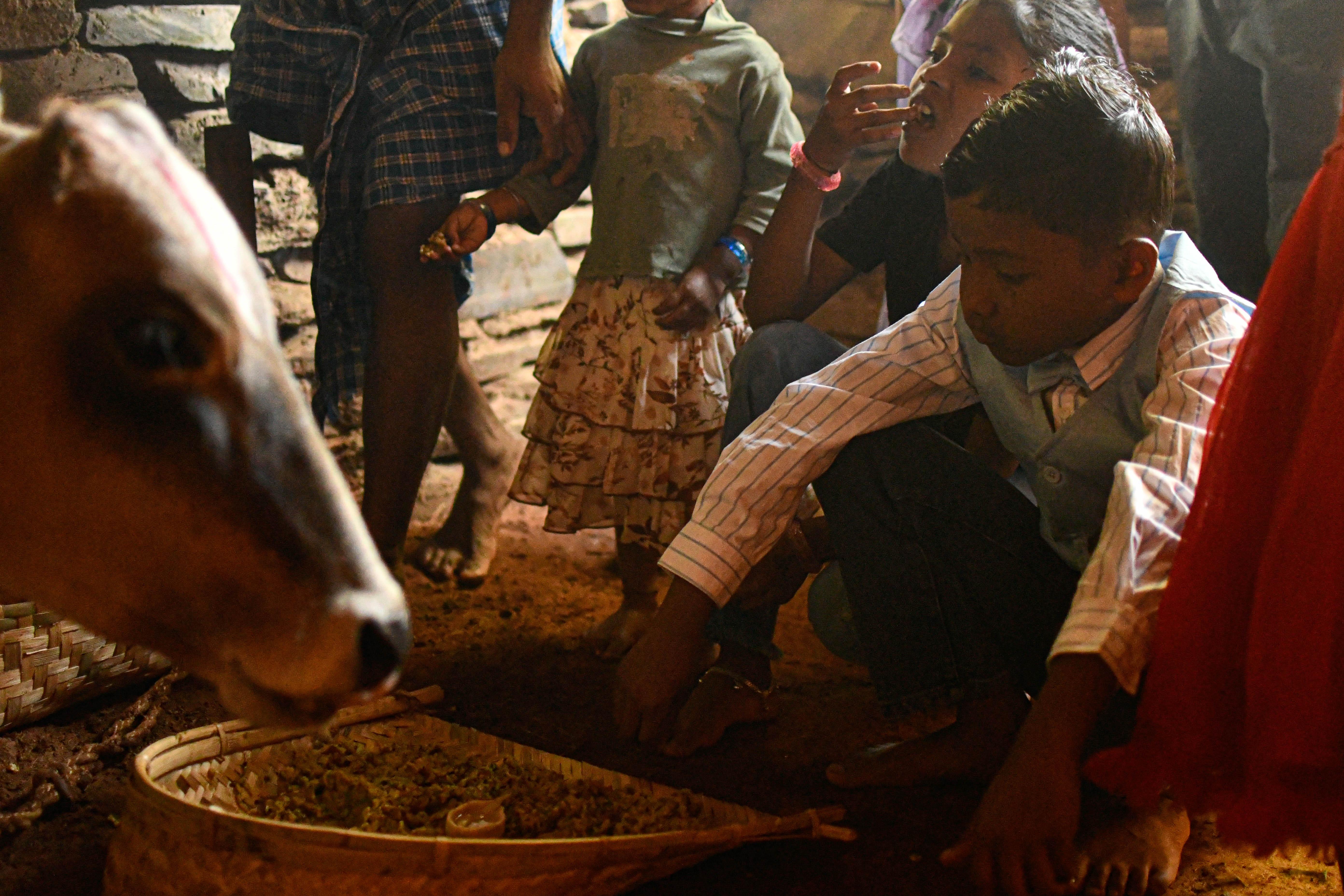 Khichdi, a rice porridge made with rice, lentils and seasonal vegetables, is cooked in a mud pot that is prayed to. Red mud is painted in a line from the house entrance to the cowshed and decorated with rice-flour designs. During the puja, khichdi is first offered to the cows. As soon as they begin to eat, children and adults sit beside them and eat together from the same basket as prasad (blessed food offering). After the puja, leftover khichdi is distributed in leaf bowls. Guests and relatives move from house to house, sharing food and celebrating late into the moonlit night, often accompanied by mahua and salfi, which are traditional forest-based drinks of Bastar. Mahua is made from fermented mahua (Madhuca longifolia) flowers, and salfi from naturally fermented palm sap. Both are shared during rituals and celebrations as part of social and cultural life. Diyaari signifies a collective act of gratitude among agricultural communities, reaffirming the deep relationship between ritual, farming, cattle rearing and forest-based livelihoods, while marking the ritual beginning of the larger Madai cycle.
