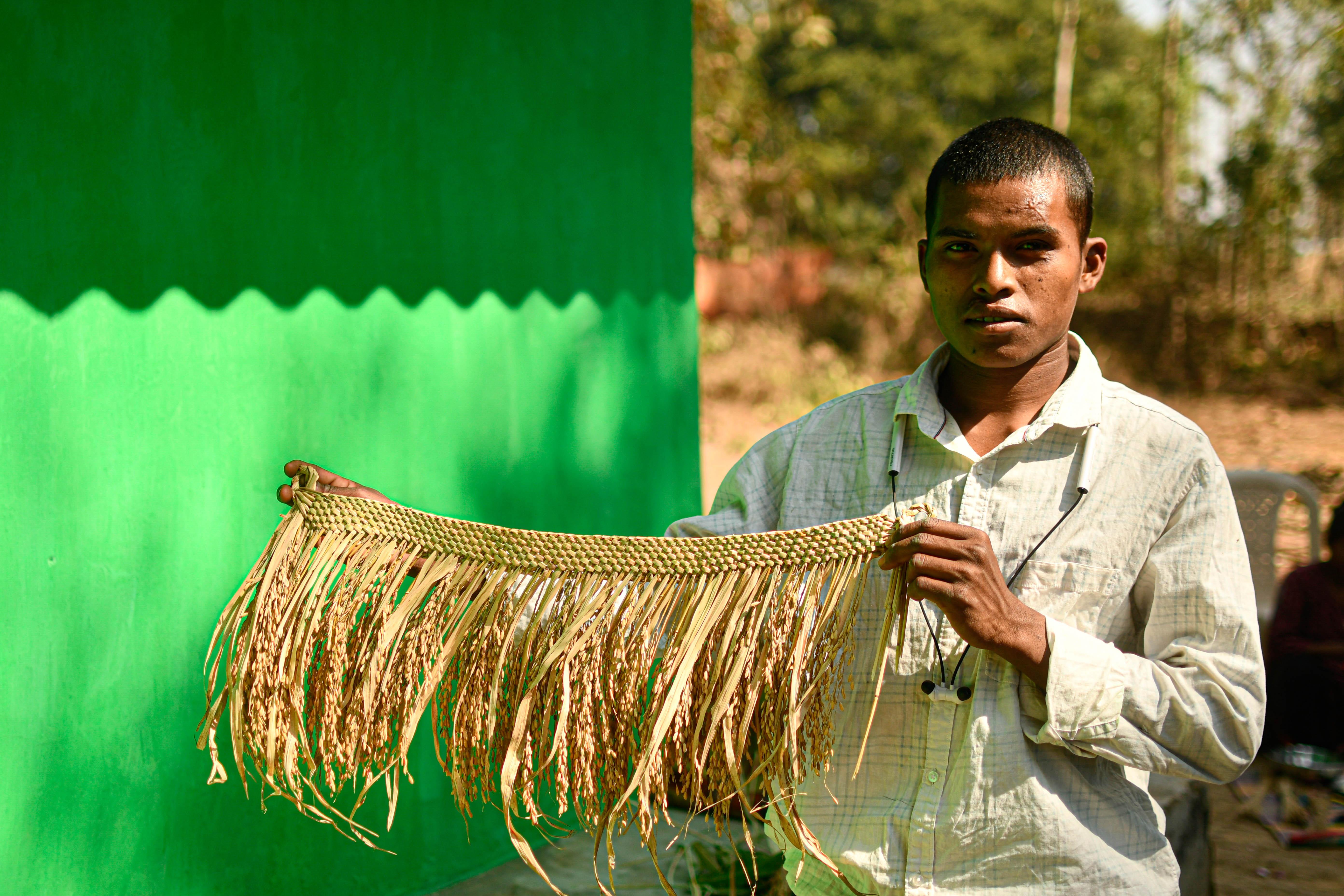 Diyaari is a celebration that brings Adivasis, along with non-Adivasi communities such as Dhurais (herders) and Kumahars (pot makers), together—where different communities meet, share, and celebrate as one. Diyaari begins with Charu, when village residents gather at the gudi (their local temple) for a sacrificial ritual. Chickens and goats are offered, cooked and shared by the entire community. This is followed by honouring the Dhurai, the herders, through songs and dancing that continue late into the night. Later, the cows of each household are bathed and taken to the village priest’s home, where a getha (sacred thread) is blessed by the village priest and then tied around the cows’ necks. Early the next morning, preparations begin in households that rear cows. A traditional barter system comes alive: potters provide cooking vessels, others make baskets and tools, and in return they receive grains and vegetables. Sela-making follows—these are ornamental door hanging made from freshly cut dhaan (paddy) placed outside every house for decoration as well as an offering for the birds. “Birds play a huge role for us,” Santu said. “They eat the insects in our farms, so even they have a share in our harvest.”